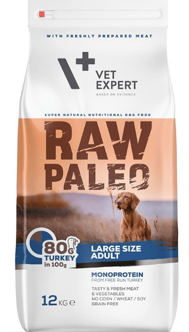 Сухий корм Vet Expert Raw Paleo (Вет Експерт Роу Палео) Adult Large Breed, з індичкою – повнораціонний корм для дорослих собак великих та гігантських порід від 1 року з вагою тіла від 25 кг. Формула корму беззернова і монобілкова, а це означає, що єдиним джерелом тваринного білка є індичка. Олія лосося та олія огірочника допомагають підтримувати належний стан шкіри та якість шерсті, а новозеландські зеленогубі мідії, які є джерелом хондроїтин сульфату та глюкозаміну позитивно впливають на розвиток кісткової системи та функціонування суглобів. Високий вміст свіжого м’яса гарантує високі смакові якості.