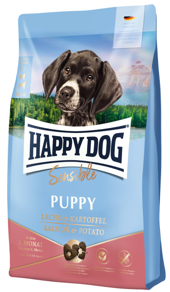 Будучи цуценям, ваш чотирилапий друг потребує багатої поживними речовинами дієти, щоб він був оптимально забезпечений у перші кілька місяців. Тому що з 1-го по 6-й місяць життя ваш маленький скарб перебуває в основній фазі зростання. Ось чому корм для собак Happy Dog Sensible Mini Puppy Salmon and Potato особливо корисний і поживний у цей період швидкого зростання.