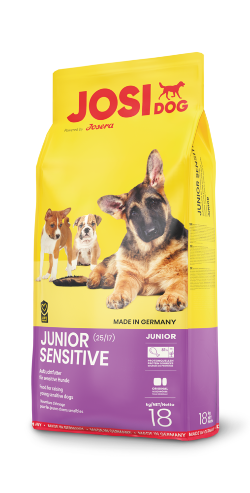 JOSERA JosiDog Junior Sensitive завдяки збалансованому співвідношенню кальцію та фосфору, підходить для чутливих собак з 8-го тижня життя. Рецептура, що не містить глютену, сприяє помірному зростанню та міцній структурі кісток.