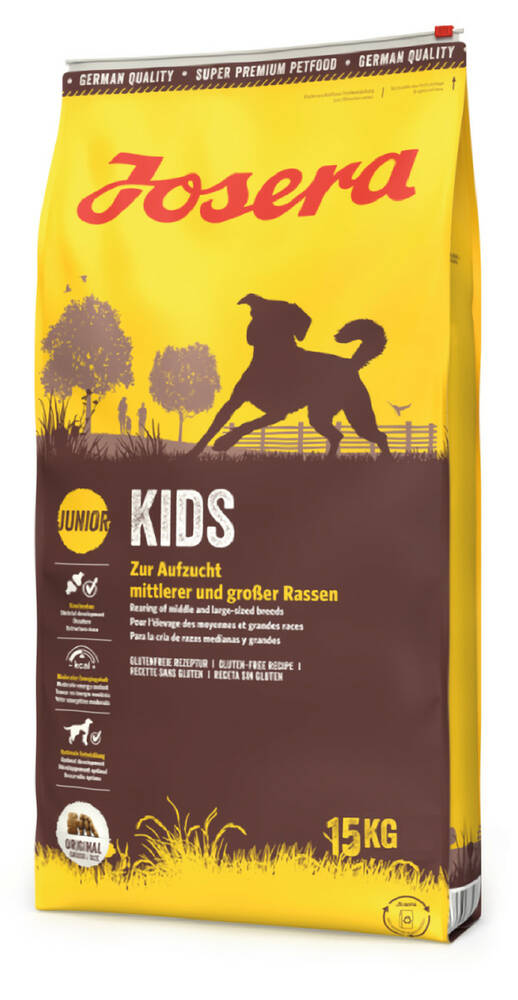 JOSERA Kids для наших молодих героїв, які рвуться вгору: спеціальний корм для вирощування собак середніх та великих порід. Рецептура зниженої калорійності з узгодженим вмістом протеїну та жиру підтримує помірну швидкість росту, міцний кістяк та здорові суглоби.