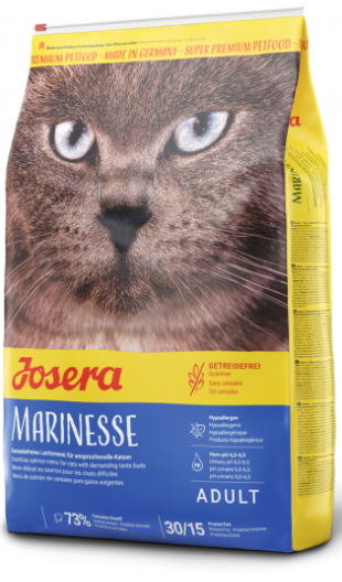 JOSERA Marinesse з великою кількістю смачного лосося є оптимальним раціоном для кішок, які полюбляють смак риби. Корм також ідеально підходить для котів, які страждають від непереносимості кормів. Унікальна формула містить тільки добре перетравні білки та не містить зернових, що робить корм ідеальним для чутливих котиків.