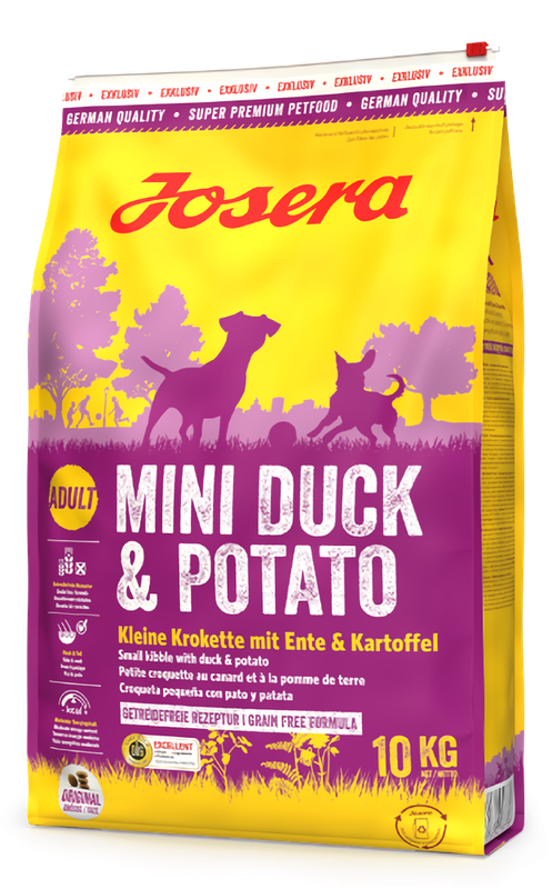 Josera Mini Duck & Potato міні-версія нашого популярного корму Ente&Kartoffel зі зменшеною крокетою для дорослих собак міні-порід. Беззернова рецептура з вишуканим качиним м’ясом забезпечує гарну шерсть і здорову шкіру завдяки біотину та цінним жирним кислотам. Містить помірний вміст енергії, саме тому ідеально підходить для собак із нормальним рівнем активності.