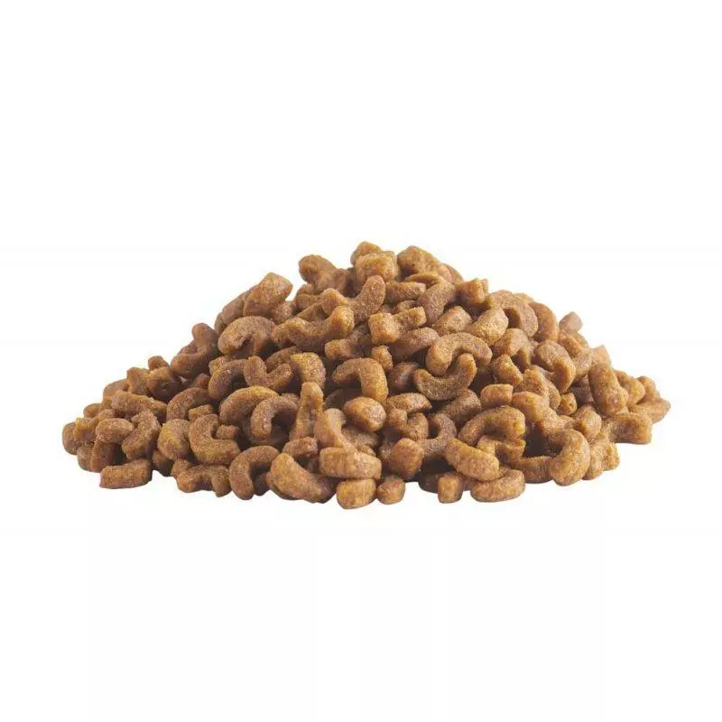 Борошно з курки 26%, кукурудза, рис, клітковина кукурудзяна, соняшникова олія, жир тваринний (з додаванням токоферолів), протеїн гідролізований тваринний, клітковина бурякова, мінерали, олія з лосося 0,5%, дріжджі пивні, насіння льону 0,27%, банан 0,23%, помідори 0,2%, глід 0,065%, імбир 0,01%, вміст добавок на 1 кг: вітамін А 10320 МО, вітамін D3 1 032 МО, вітамін Е 516 мг, вітамін С 258 мг, вітамін К 1 мг, вітамін В1 5,1 мг, вітамін В2 3,9 мг, вітамін В5 4,1 мг, вітамін РР 36,7 мг, вітамін В6 3,06 мг, фолієва кислота 0,98 мг, вітамін В12 0,14 мг, біотин 0,07 мг, холін хлорид 60% 3,2 г, цинк (Е6) 83,2 мг, залізо (Е1) 30,46 мг, марганець (Е5) 24,3 мг, мідь (Е4) 7,7 мг, таурин 2 072 мг, антиоксиданти, консервант.