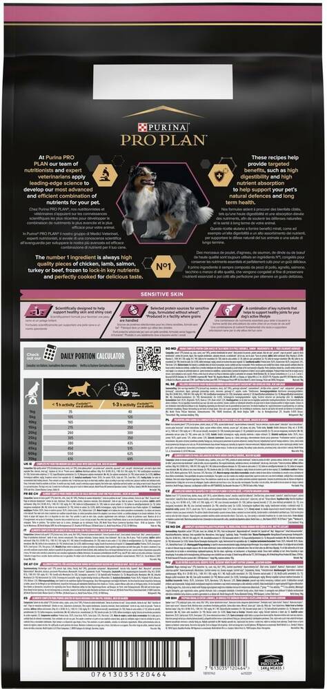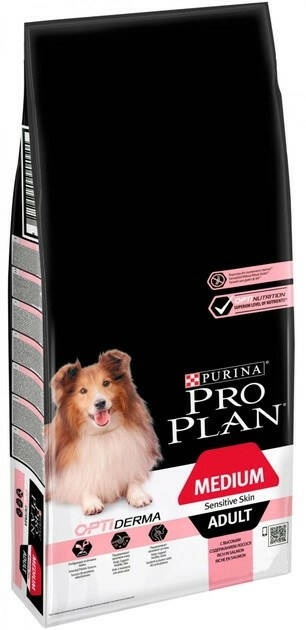 Purina Pro Plan Dog Adult OptiDerma з лососем та рисом - сухий повнораціонний корм для дорослих собак середніх порід з чутливою шкірою. З лососем. Якщо Ваш собака середньої породи має схильність до алергії, цей повнораціонний корм був розроблений спеціально, щоб допомогти задовольнити його потреби, та призначений для допомоги у боротьбі з алергією. Цей сухий корм для собак поєднує поживні речовини, дія яких спрямована на шкіру собаки, допомагаючи підтримати природнє здоров'я шерсті. Він також містить підібрані джерела білків для зменшення можливих шкірних реакцій, пов'язаних з чутливістю до їжі. Цей повнораціонний сухий корм з високим вмістом лосося містить усі необхідні поживні речовині, яких потребує Ваш собака для здорової та активної життєдіяльності. Він також допомагає підтримувати здоров'я суглобів.