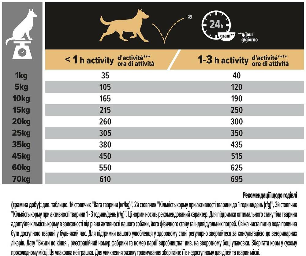 Детальні рекомендації щодо дозування вказані на упакуванні. Підтримання оптимальної маси тіла дуже важливо для здоров'я вашого цуценяти. Рекомендована добова норма може варіюватися в залежності від рівня активності, фізичних особливостей і індивідуальних потреб вашої тварини. слідкуйте, щоб у собаки завжди була чиста, свіжа питна вода. для контролю здоров'я вашого собаки звертайтесь у ветеринарну клініку на регулярній основі.