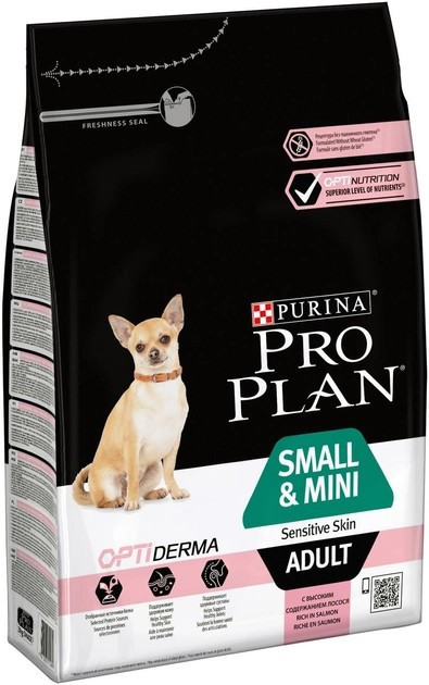 Сухий повнораціонний корм PRO PLAN (Про План) для собак дрібних порід, схильних до алергії. Деякі собаки страждають від проблеми чутливої шкіри. Такі тварини, не маючи жодних інших проблем зі здоров’ям, чухаються значно частіше, ніж інші собаки, і рівень лупи в них теж значно вищий, ніж у собак з нечутливою шкірою. Розроблений нашими ветеринарами та дієтологами сухий корм для собак PROPLAN з OPTIDERMA забезпечує досконале харчування, що підтримує здоров’я шкіри собак.