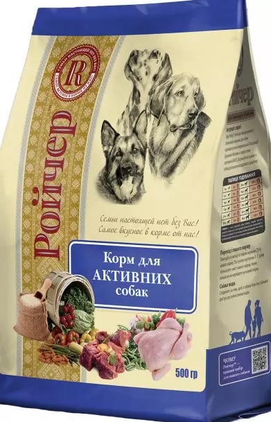Корм «Ройчер» для активних собак був спеціально розроблений для атлетично розвинених дорослих собак з помірною або підвищеною фізичною активністю. Даний корм ідеально підходить як для мисливських і службових порід, так і для собак, що живуть і у зимовий період зовні будівлі. Висока засвоюваність даного продукту разом з оптимальним рівнем елементів забезпечить вашому собаці гарний обмін речовин, підтримку імунної системи, прекрасну фізичну форму та яскраву шерсть.