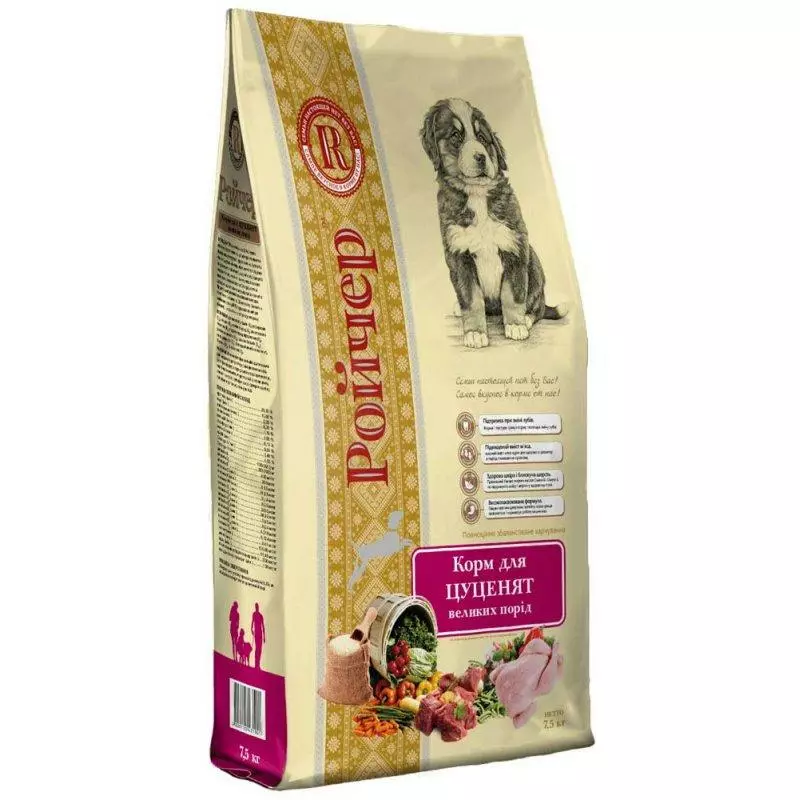 Корм «Ройчер» для цуценят великих порід є збалансованим і повноцінним харчуванням, яке спеціально розроблене для задоволення потреб цуценят різних порід, а також для годуючих собак. Наявність усіх необхідних компонентів забезпечить правильний розвиток скелета та мускулатури, сформує міцні зуби та покращить обмін речовин. Оптимальний баланс Omega-3 та Omega-6 забезпечить ріст здорової шерсті. А найголовніше, корм зовсім не має штучних барвників, антиоксидантів та кормових добавок, які є дуже шкідливими для маленької тварини.