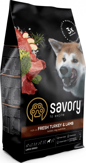 Savory Large Breeds rich in Fresh Turkey and Lamb - холістична рецептура корму зі свіжою індичкою та дегідрованим ягням для підтримки оптимальної кондиції як малорухливих собак, так і улюбленців із нормальною активністю.
