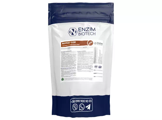 Азотфиксирующий инокулянт для сои «БиоМАГ Соя» - сухой препарат для предпосевной инокуляции семян сои на основе культуры клубеньковых бактерий Bradyrhizobium japonicum штамма LZ 21 и LZ17-ГМ с титром не менее 2х10 9 КУ/г с титром не менее 1х10 8 КОЕ/г и продукты их метаболизма (фитогормоны, аминокислоты, витамины).