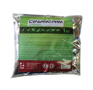 Сульфатрим (порошок для орального застосування) Опис Порошок від білого до світло-жовтого кольору без запаху, добре розчинний у воді. Склад 100 г препарату містить діючі речовини: сульфадиметоксину натрієва сіль - 4 г; триметоприм - 2 г. Допоміжна речовина: лактоза моногідрат. Фармакологічні властивості АТСvet класифікаційний код QJ01 - антибактеріальні ветеринарні препарати для системного застосування. Сульфатрим - комбінований хіміотерапевтичний препарат широкого спектру антимікробної дії. Сульфадиметоксин - активний до грампозитивних і грамнегативних бактерій (Staphylococcus spp., Streptococcus spp., Clostridium spp., Salmonella spp., E. coli, Haemophilus spp., Pasteurella spp., Listeria monocytogenes, Corynebacterium spp., Klebsiella spp., Proteus spp., Bordetella spp. та інші), а також діє на найпростіші (Coccidia, Toxoplasma) та рикетсії (Rickettsia spp.), менш активний щодо протею. Механізм дії пов'язаний з ПАБК і конкурентним пригніченням дигідроптероатсинтетази, що призводить до порушення синтезу тетрагідрофолієвої кислоти, необхідної для синтезу пуринів і піримідинів. Триметоприм - хіміотерапевтична речовина, що володіє бактеріостатичною дією проти грампозитивних (Staphylococcus spp., Streptococcus spp., Clostridium spp., Corynebacterium spp. і інші) та грамнегативних (Е. coli, Salmonella spp., Klebsiella spp., Proteus spp., Pasteurelia spp., Bordetella spp. тощо) мікроорганізмів. Він інгібує активність бактеріальної редуктази, яка перетворює дегідрофолієву кислоту в тетрагідрофолієву, яка є необхідною для синтезу пуринів і нуклеїнових кислот. Цим самим триметоприм блокує один із основних процесів метаболізму бактерій на шляху синтезу білка. Активні речовини триметоприм та сульфадиметоксин діють синергічно. Вплив сульфадиметоксину посилюється триметопримом. Поєднання цих двох речовин стимулює блокування біосинтезу фолієвої кислоти. Сульфадиметоксин порівняно повільно всмоктується із травного каналу, хоча виявляється у крові вже через 30 хвилин після введення. Терапевтична концентрація в організмі утримується протягом 24 - 48 годин. Період напіввиведення препарату із сироватки крові становить 11 - 14 годин. Триметоприм зв'язується з білками плазми крові на 70%. Високу концентрацію триметоприму виявляють у секреті бронхіальних залоз, передміхуровій залозі та в жовчі. Період напіврозпаду триметоприму в плазмі крові становить 8 - 10 годин. Протягом 72 годин виводиться із сечею 66,8%. Застосування Лікування у телят, козенят, ягнят, свиней, кролів, свійської птиці (курчат-бройлерів, індиків, курей-несучок та батьківських ліній) колібацильозу, пастерельозу, сальмонельозу, кокцидіозу, а також захворювань травного каналу, органів дихання та сечовивідних шляхів, які спричинені мікроорганізмами, чутливими до сульфадиметоксину та триметоприму. Дозування Перорально з питною водою у дозах: телята, козенята, ягнята, свині - 10 г препарату на 40 кг маси тіла щодобово (10 г препарату на 5 л питної води щодобово) протягом 5 діб; або з кормом (60г на 10кг корму). кролі - 8 г препарату на 1 л питної води щодобово протягом 5 діб; свійська птиця (курчата-бройлери, індики, кури-несучки та батьківські лінії) - 200 г препарату на 100 л питної води, або (4кг препарату на 1 тонну корму) протягом 5 діб. При лікуванні кокцидіозу доза становить 800 г препарату на 100 л питної води протягом 3-5 діб. Протягом лікування дають воду тільки з препаратом. Після розчинення препарату у питній воді, розчин необхідно використати протягом 24 годин. Протипоказання Підв