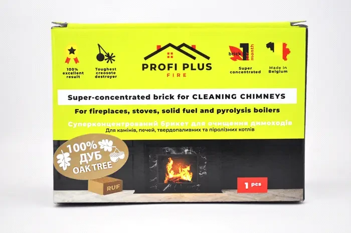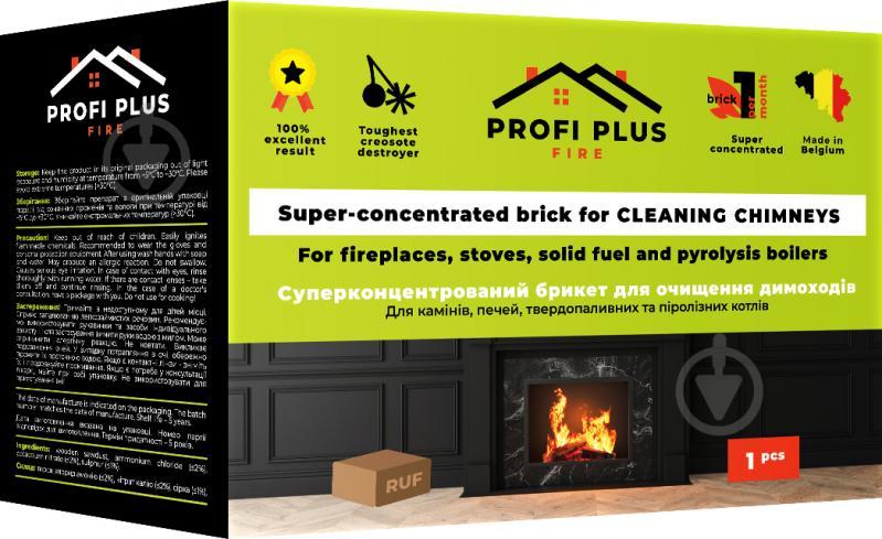 Profi Plus Fire Суперконцентрований брикет для очищення димарів - це спресований з тирси та хімічних реагентів брикет для видалення складних забруднень креозотом і сажею в димарях, трубах та інших важкодоступних місцях опалювальної системи.
