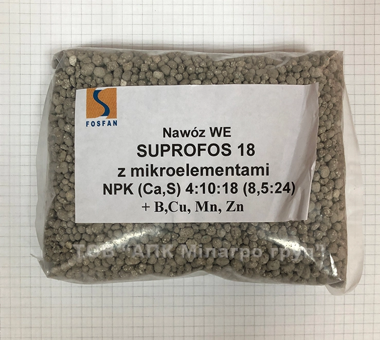Супрофос 18 з мікроелементами NPK ( Ca , S) 4-10-18- (8,5-24) + B, Cu , Mn , Zn - високотехнологічне гранульоване добриво , що містить оптимальний вміст Марко -, мезо- та мікроелементів для основного живлення зернових та інших сільськогосподарських культур. Супрофос 18 з мікроелементами NPK ( Ca , S) 4-10-18- (8,5-24) + B, Cu , Mn , Zn складається з :