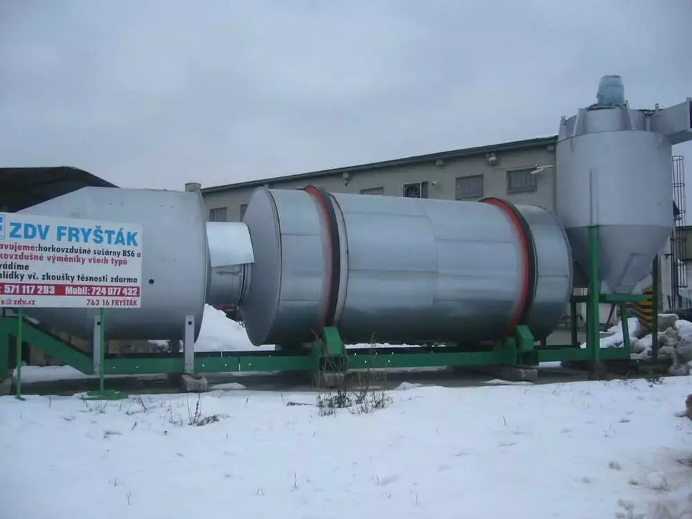 Сушильний барабан – це основний елемент комплексу, який забезпечує рівномірне сушіння сировини. Барабан має спеціальні лопаті, які піднімають матеріал під час обертання для кращого контакту з гарячим повітрям.