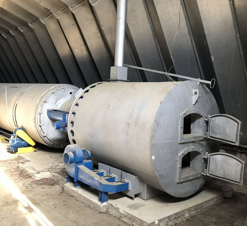 Джерелом тепла є теплогенератор (піч), яка працює на дровах, Додатково установлений бункер накопичувач з автоматизована подачої сировини в теплогенератор для спалювання в автоматичному режимі з контролем вологи сировини. Матеріал для спалювання це деревинна тирса, тріска, пелети, різної вологи.
