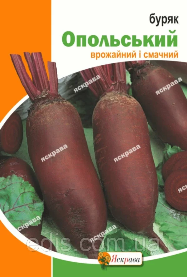 Буряк Опольська 20 г Сорт відрізняється високою врожайністю. Період вегетації - 110-120 днів. Коренеплід циліндричний, м'якоть інтенсивно-червоного кольору, дуже смачний і соковитий. Рекомендується для зберігання в осіннє-зимовий період і переробки.