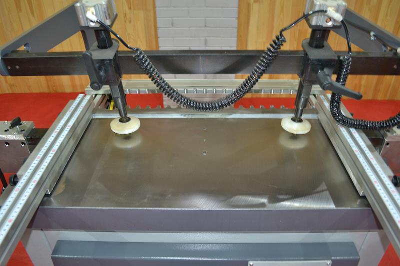 Небольшая массивная конструкция которую можно без проблем перемещать. Вес 275 килограмм, но благодаря ножкам размещенных по краям, под него можно заехать роквой и без проблем перемещать. Большие габариты придает складная линейка, для нормальной работы нужна площадь 3.5 на 3.5 метра. Стол имеет размеры 88 x 42.5 сантиметра. Над ним установлено два пневматических зажима на которых можно регулировать силу зажимания.