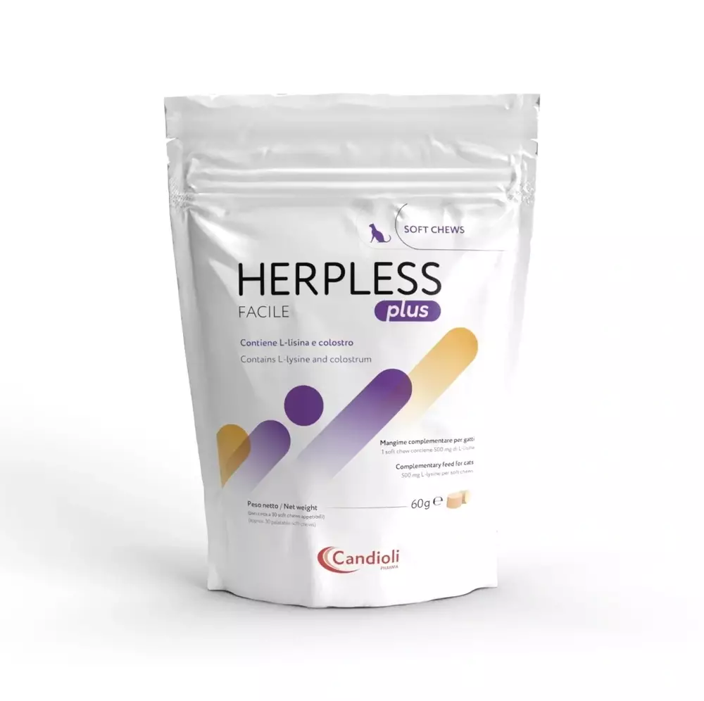 Candioli Herpless Fasile - добавка у вигляді жувальних таблеток, що містять амінокислоту L-лізин, яка замінює аргінін під час появи вірусу, пригнічує його та ефективно знищує вірусні інфекції в організмі котів. Можна застосовувати котам будь-якого віку, а також кошенятам до 6 місяців як харчову добавку в умовах, що потребують введення L-лізину.