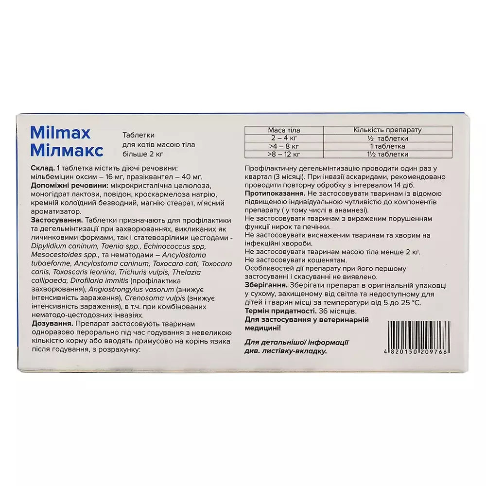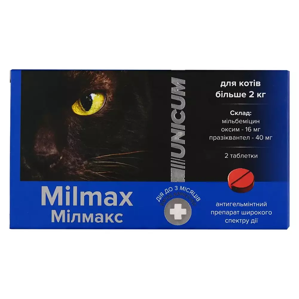 Таблетки для котів більше 2 кг Унікум Unicum Milmax Мілмакс антигельмінтні №2 (дія до 3 місяців)