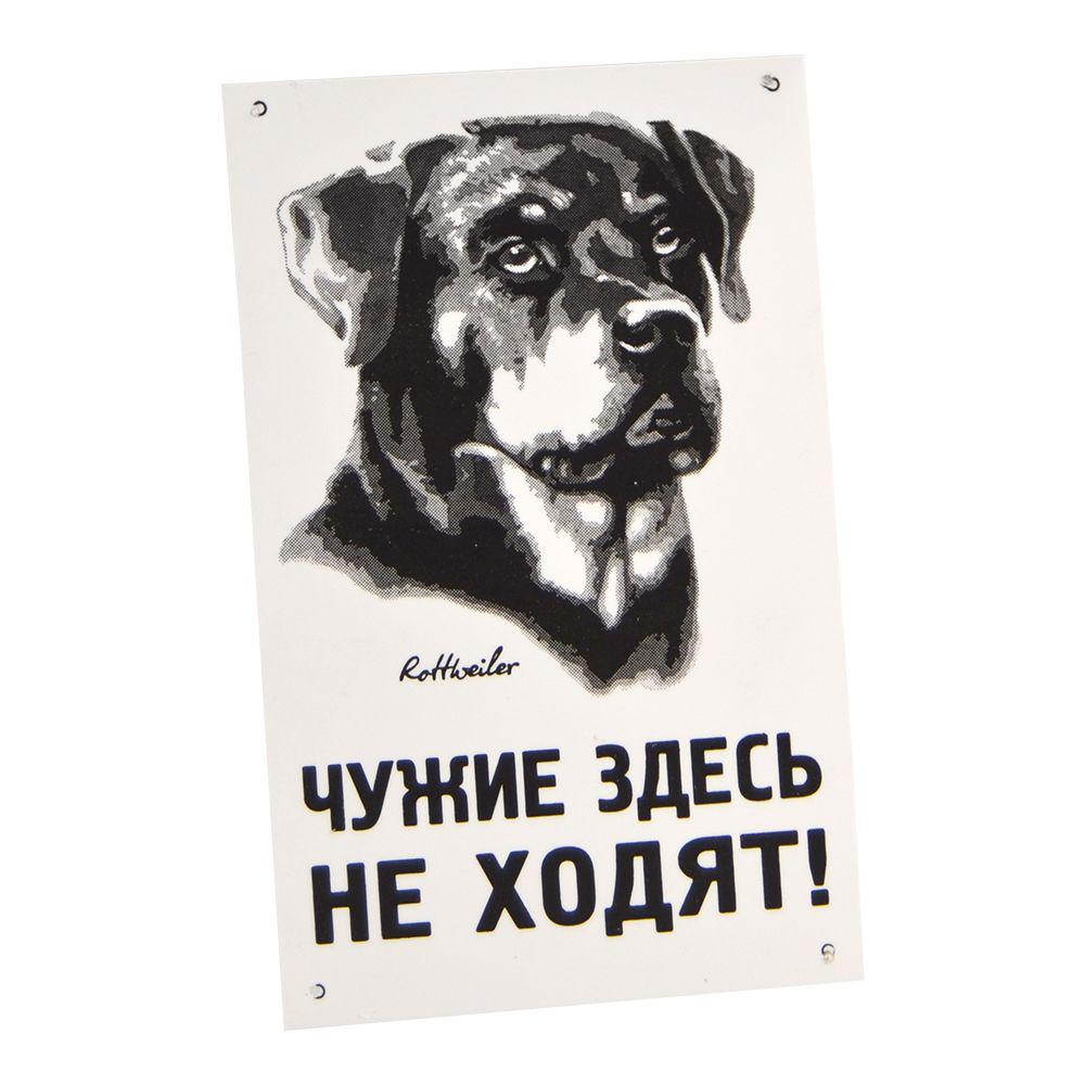 Табличка «Чужі тут не ходять» виготовлена з високоякісного пластику і прикрашена фото ротвейлера, якого вважають еталоном сторожової собаки. Для поліпшення експлуатації виріб з усіх чотирьох сторін обладнано спеціальними отворами для кріплення.