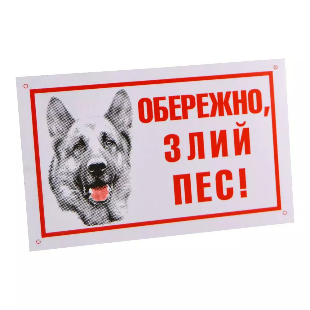 Табличка «Обережно, злий пес!» виготовлена з високоякісного пластику і прикрашена фото німецької вівчарки, яку вважають еталоном сторожової собаки. Для поліпшення експлуатації виріб з усіх чотирьох сторін обладнано спеціальними отворами для кріплення.