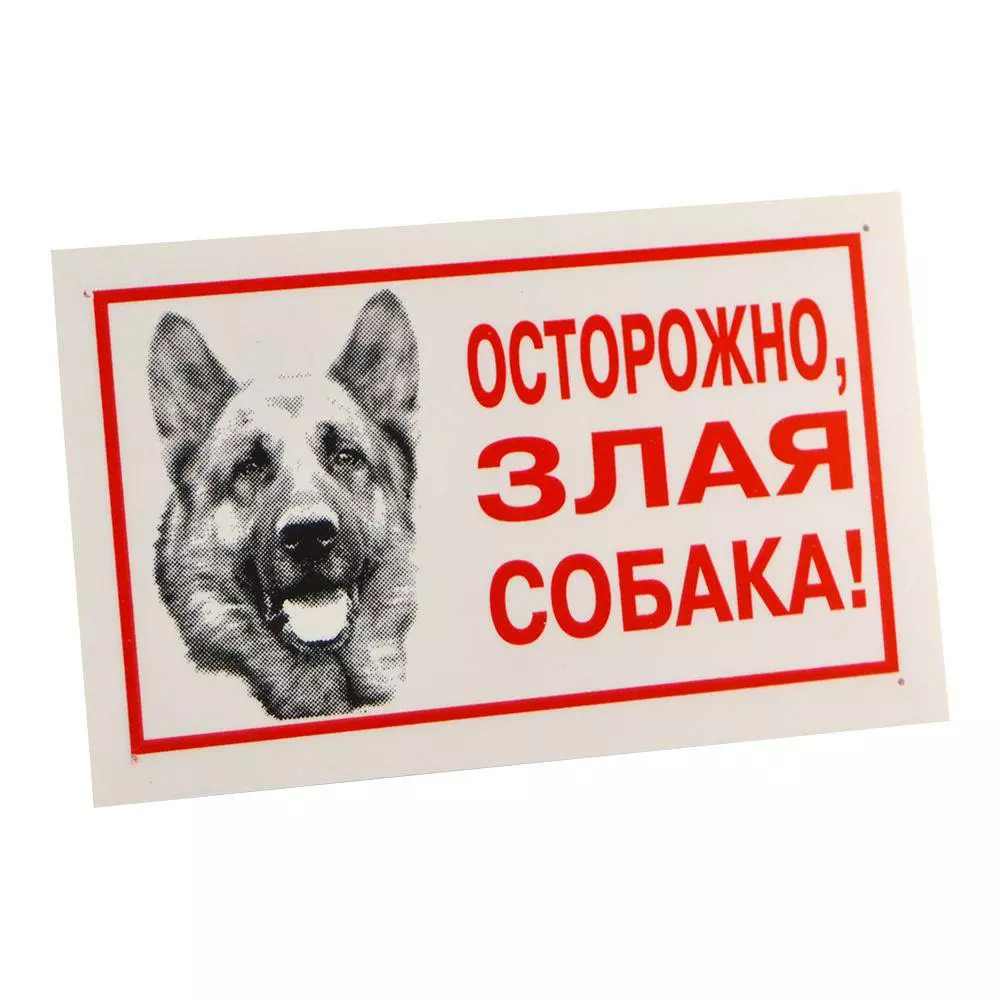 Табличка «Обережно, злий собака!» виготовлена з високоякісного пластику і прикрашена фото німецької вівчарки, яку вважають еталоном сторожової собаки. Для поліпшення експлуатації виріб з усіх чотирьох сторін обладнано спеціальними отворами для кріплення.