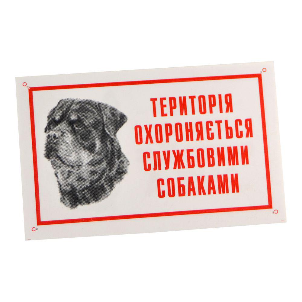 Табличка «Приватна територія охороняється службовими собаками» виготовлена з високоякісного пластику і прикрашена фото ротвейлера, якого вважають еталоном сторожової собаки. Для поліпшення експлуатації виріб з усіх чотирьох сторін обладнано спеціальними отворами для кріплення.
