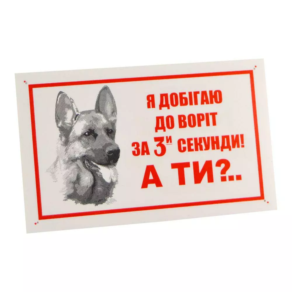 Табличка «Я добігаю до воріт за 3 секунди. А ти?..» виготовлена з високоякісного пластику і прикрашена фото німецької вівчарки, яку вважають еталоном сторожової собаки. Для поліпшення експлуатації виріб з усіх чотирьох сторін обладнано спеціальними отворами для кріплення.