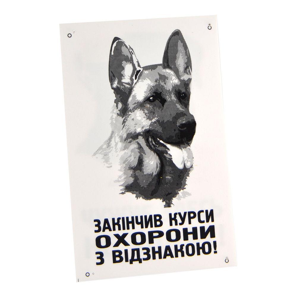 Табличка «Закінчив курси ОХОРОНИ з відзнакою» виготовлена з високоякісного пластику і прикрашена фото німецької вівчарки, яку вважають еталоном сторожової собаки. Для поліпшення експлуатації виріб з усіх чотирьох сторін обладнано спеціальними отворами для кріплення.