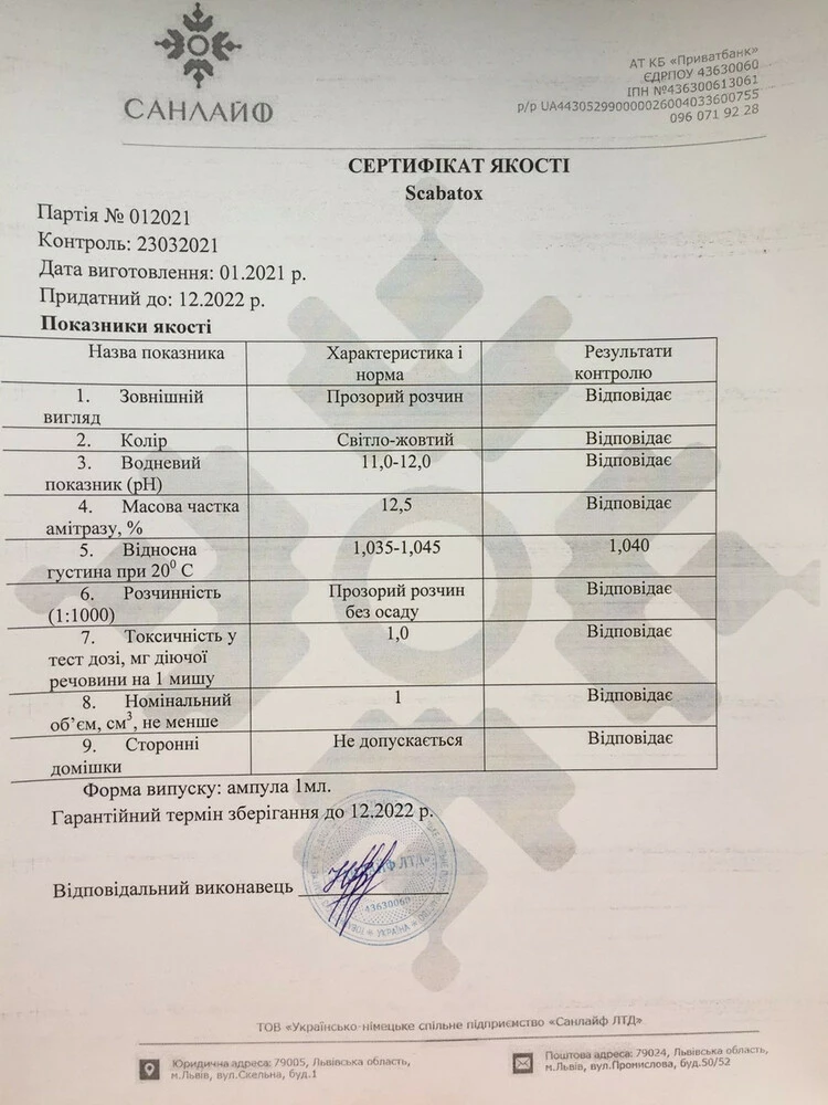 Тактик (Скабатокс) - 1 мл Румунія (аналог угорського Тактика) – препарат використовується в лікувальних цілях для ефективної боротьби з варроатозом (кліщем вароа). Діючою речовиною препарату є амітраз (12.5%). Препарат сертифікована, сертифікат додається до фото.