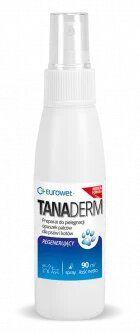 Eurowet Tanaderm - спрей для захисту та регенерації подушечок лап тварин. Є ветеринарним засобом, який живить шкіру, заспокоює подушечки лап та стимулює відновлення епідермісу. Інгредієнти засобу регулюють мікрофлору шкіри і мають дію, що розгладжує.