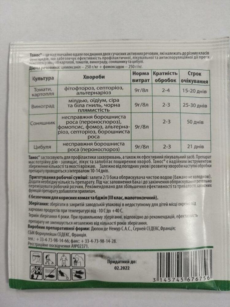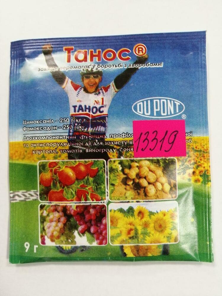 Танос — високоефективний двокомпонентний фунгіцид лікувально-профілактичного впливу. Призначений для захисту посадок картоплі, овочів, виноградників і соняшника. Активні речовини — фамоксадон, цимоксаніл.