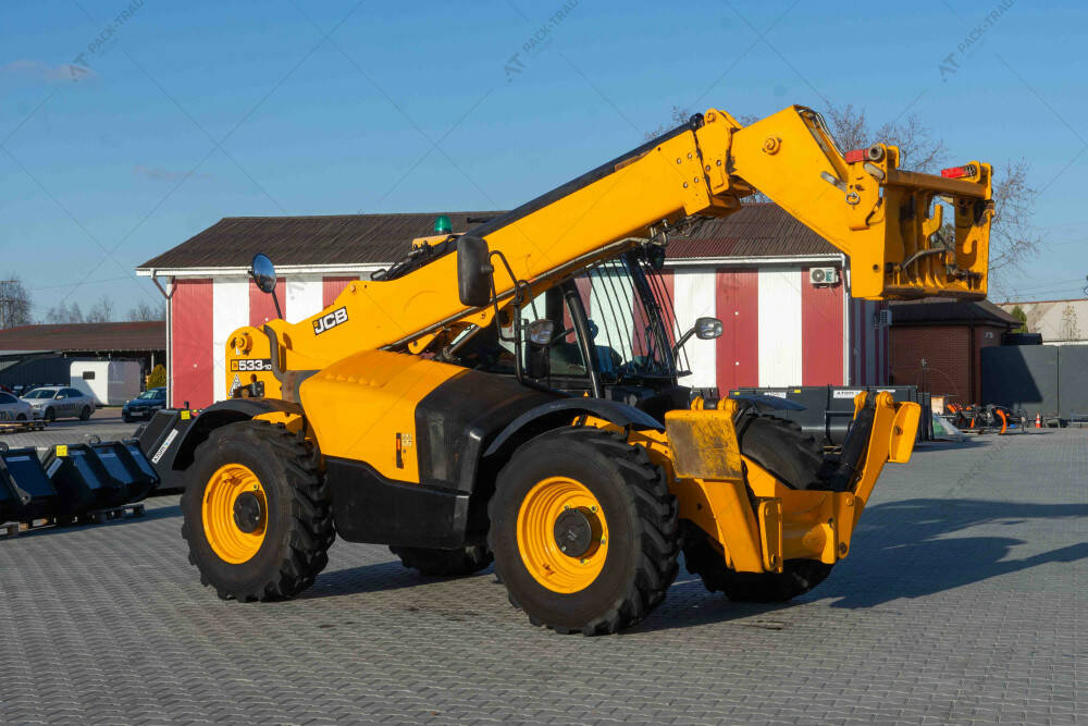 Навантажувач б/в JCB 533-105, 2017 р/в, з напрацюванням 4614 м/год. Вантажопідйомність – 3300 кг. Висота підйому – 10,5 м. Висота – 2,5 м. Ширина – 2,35 м. Кондиціонер. Шини – Alliance 400/80-24. Додаткове робоче освітлення спереду. Захист лобового скла та даху кабіни. Нижній захист КПП та карданів. Захист розподільника.