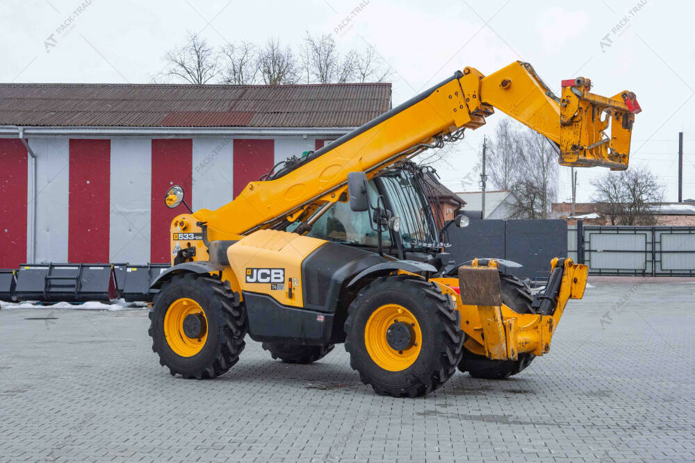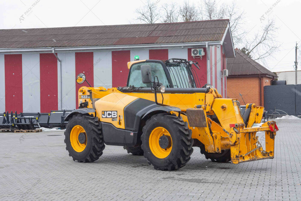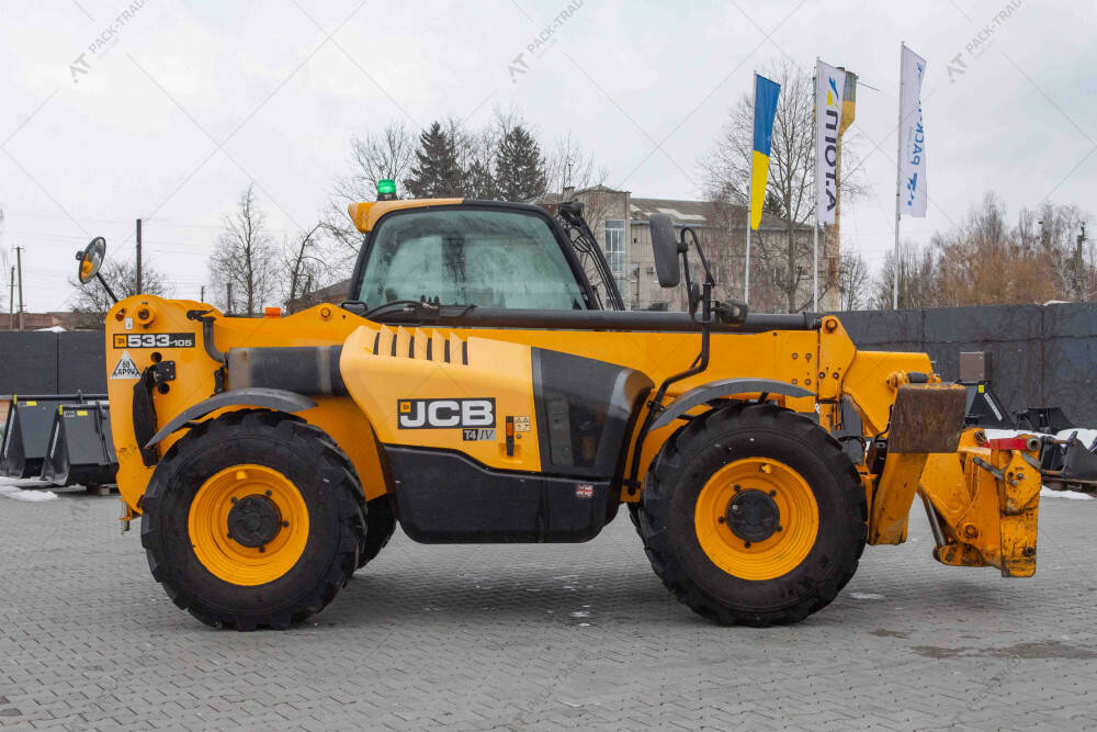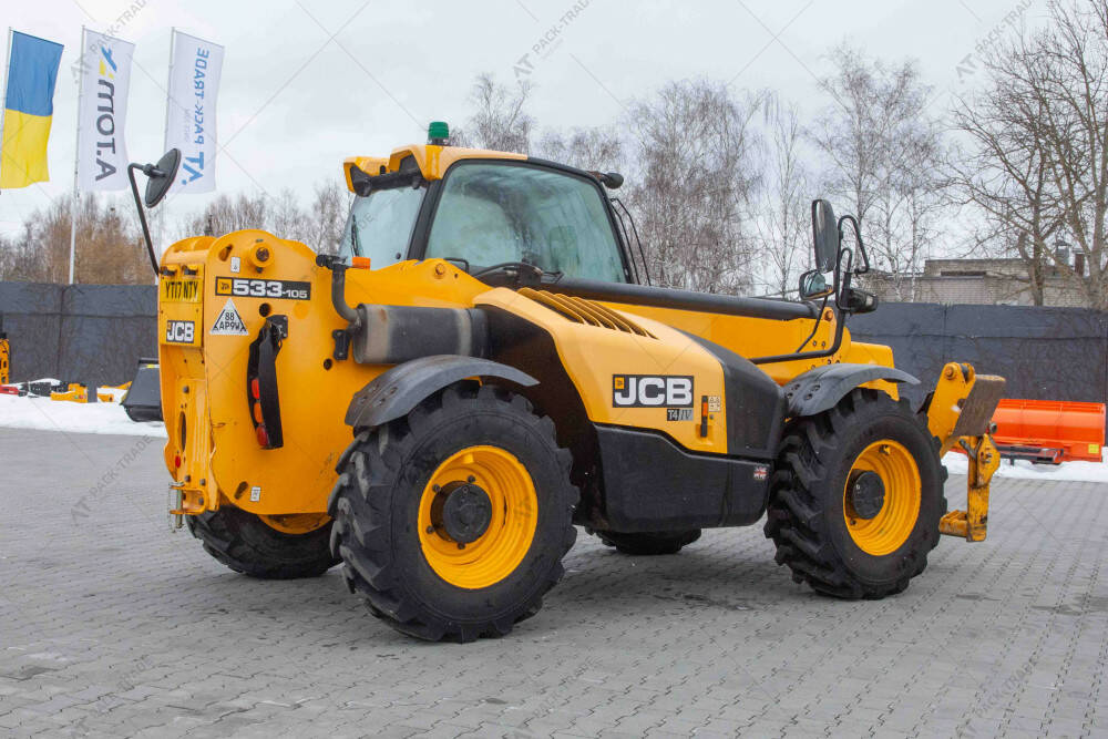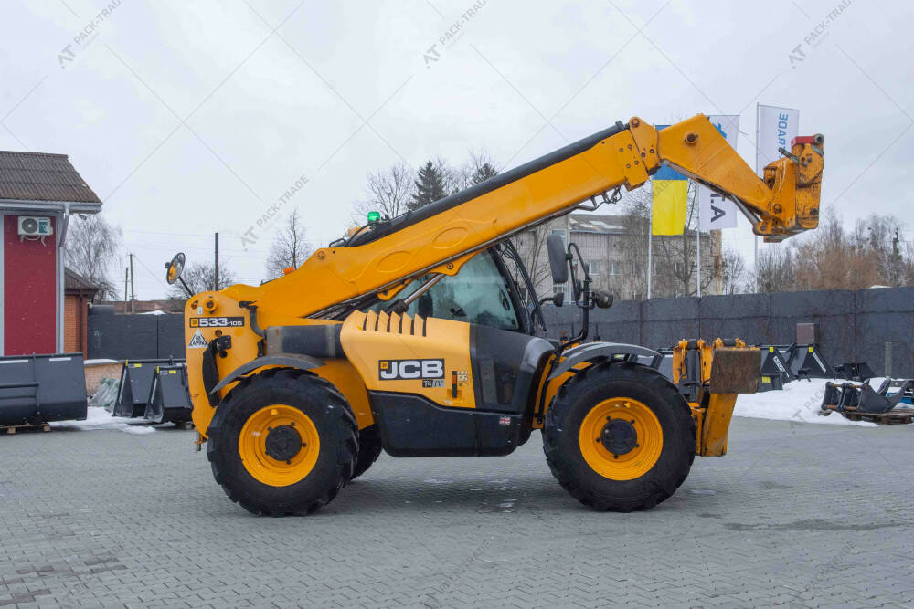 Навантажувач б/в JCB 533-105, 2017 р/в, з напрацюванням 3444 м/год. Вантажопідйомність — 3300 кг. Висота підйому — 10,5 м. Шини 15/5-80-24. Кондиціонер. Важелі. Захист лобового скла. Додаткове робоче освітлення спереду. Нижні захисти КПП та карданів.