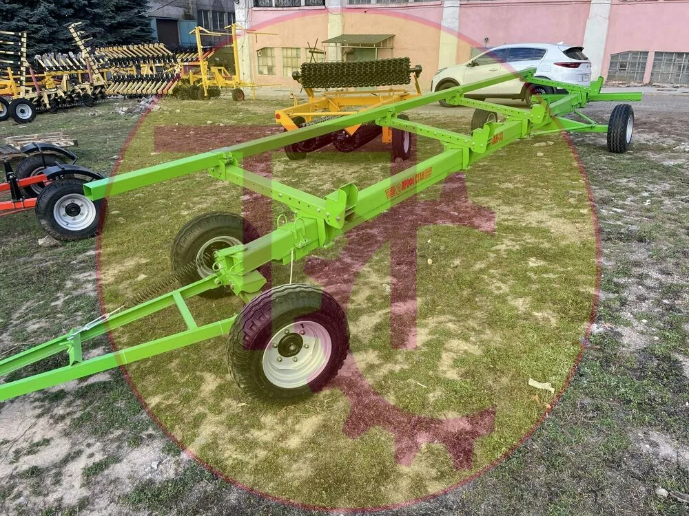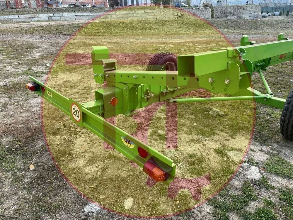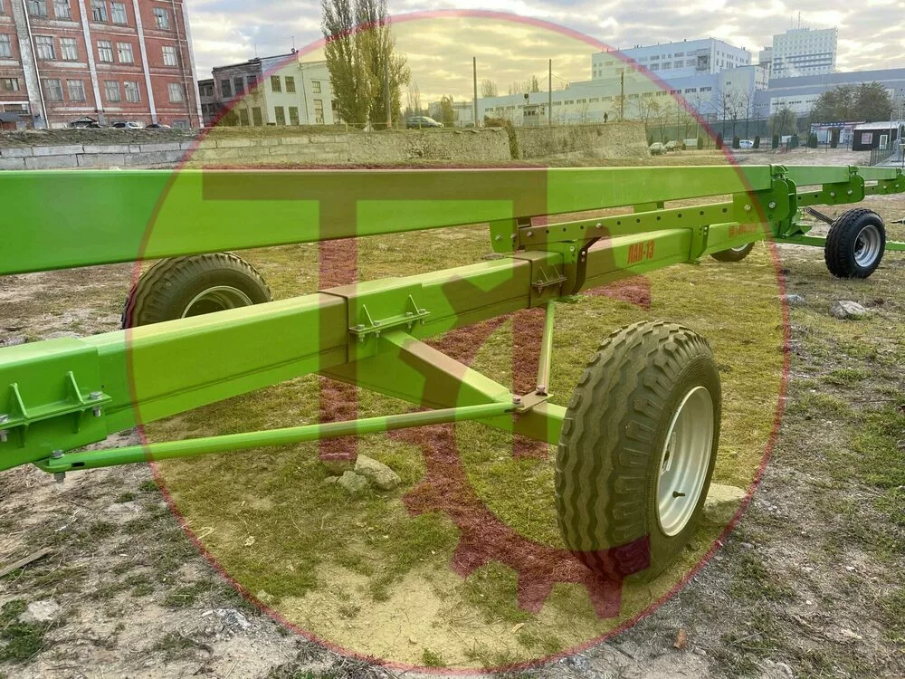 Універсальний візок для перевезення жниварок ЛАН-13 призначений для транспортування зернових, кукурудзяних та соняшникових жниварок безпосередньо самим комбайном, обладнаним причіпним пристроєм, а також здійснити зручне зберігання жниварки в зимовий період. Доцільно використовувати для перевезення жниварок із шириною захвату до 9 м. Комплектується 14ти шаровою с/г гумою підвищеної вантажопідйомності 2000 кг на колесо та посиленими маточками власної розробки. Передній міст візка обладнаний балансиром, який дозволяє точно копіювати рельєф з метою запобігання викривленню рами. На візок встановлений задній висувний бампер, обладнаний всією необхідною світлотехнікою. Центральний брус рами виготовлений з високоякісної труби 150х180х6 Ст20 додатково посилений швеллером №14. Задній міст може пересуватися вздовж центральної балки для точного агрегатування жниварки з візком, а також додатково обладнаний трубчастими тягами для збільшення жорсткості.