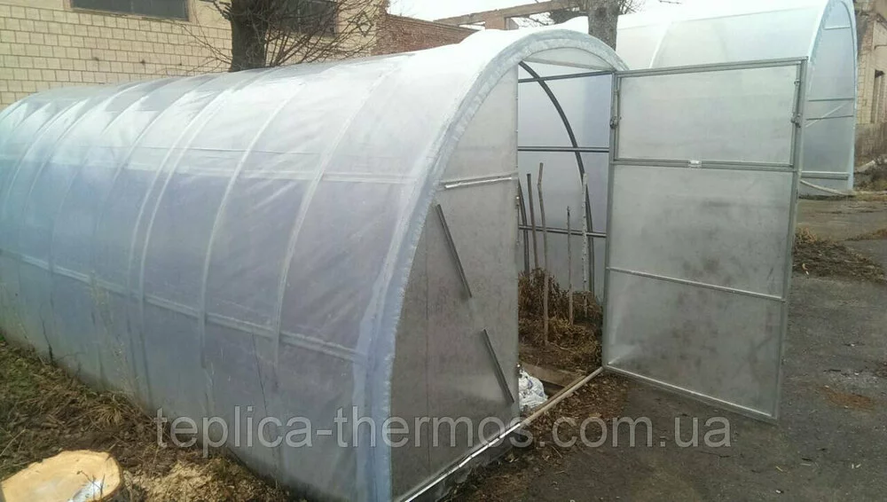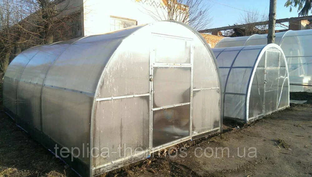 Каркас теплиці виготовлений з оцинкованого М-профіля, який має гарні антикорозійні характеристики та високу зносостійкість.Дверні блоки теплиці виготовлені з квадратної профільної оцинкованої труби 20*20 і комплектуються по два амортизатора на один віконний отец. Дверні блоки постачаються вже зібрані.Каркас теплиці накривається багатосезонною плівкою , а торці теплиці полікарбонатом завтовшки 4 мм