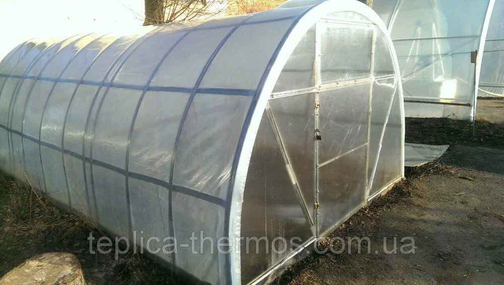 Каркас теплиці виготовлений з оцинкованого М-профіля, який має гарні антикорозійні характеристики та високу зносостійкість.Дверні блоки теплиці виготовлені з квадратної профільної оцинкованої труби 20*20 і комплектуються по два амортизатора на один віконний отец. Дверні блоки постачаються вже зібрані