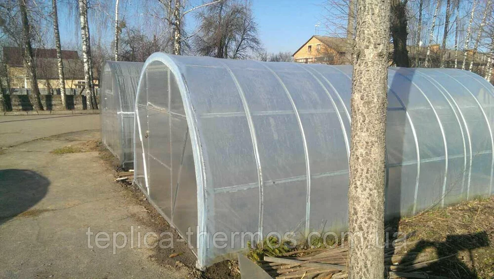 Каркас теплиці виготовлений з оцинкованого М-профіля, який має гарні антикорозійні характеристики та високу зносостійкість.Дверні блоки теплиці виготовлені з квадратної профільної оцинкованої труби 20*20 і комплектуються по два амортизатора на один віконний отец. Дверні блоки постачаються вже зібрані.Каркас теплиці накривається багатосезонною плівкою , а торці теплиці полікарбонатом завтовшки 4 мм