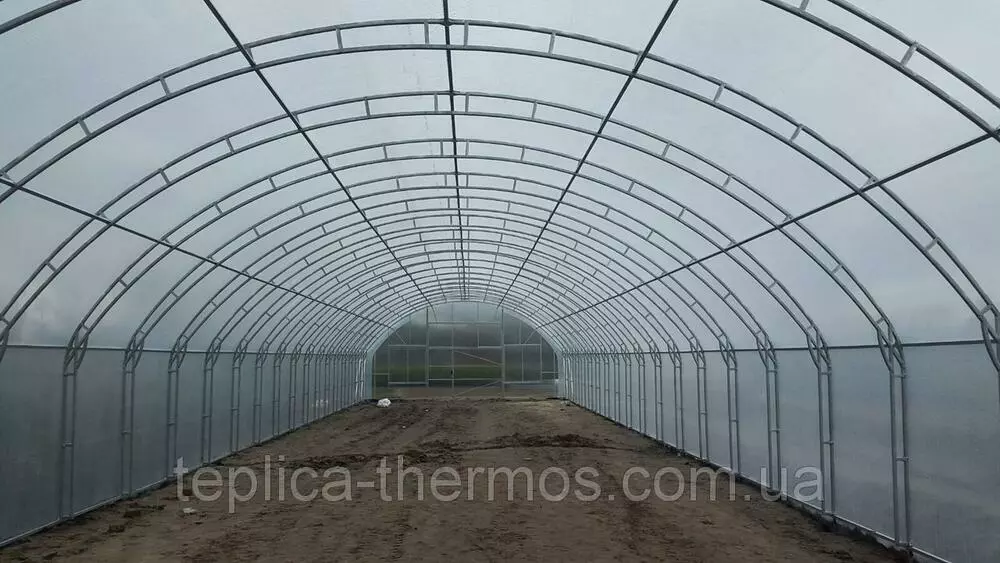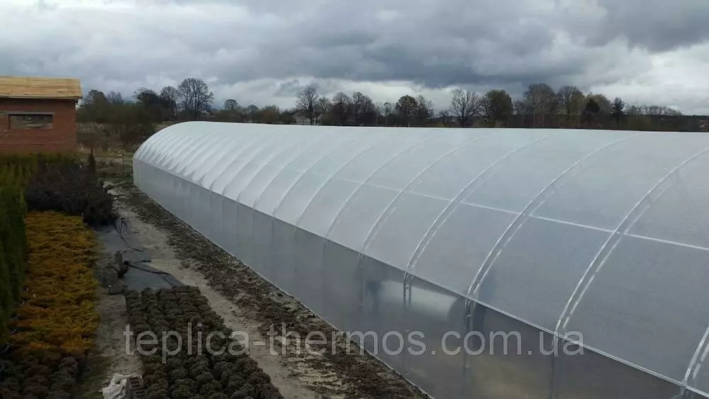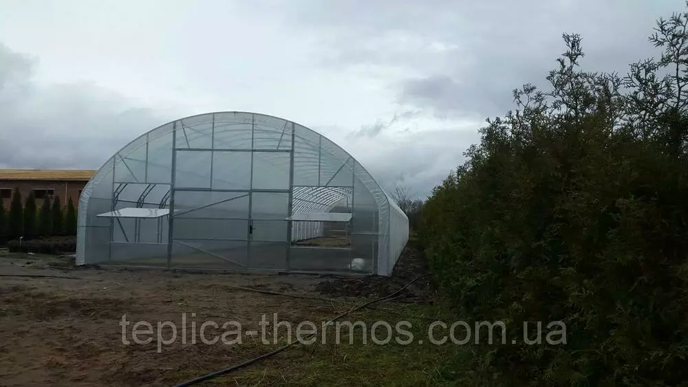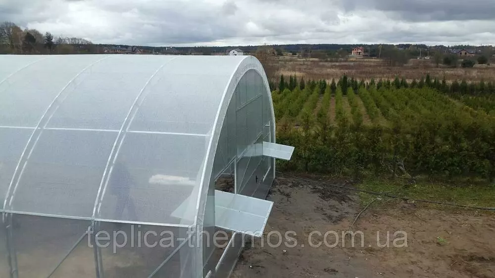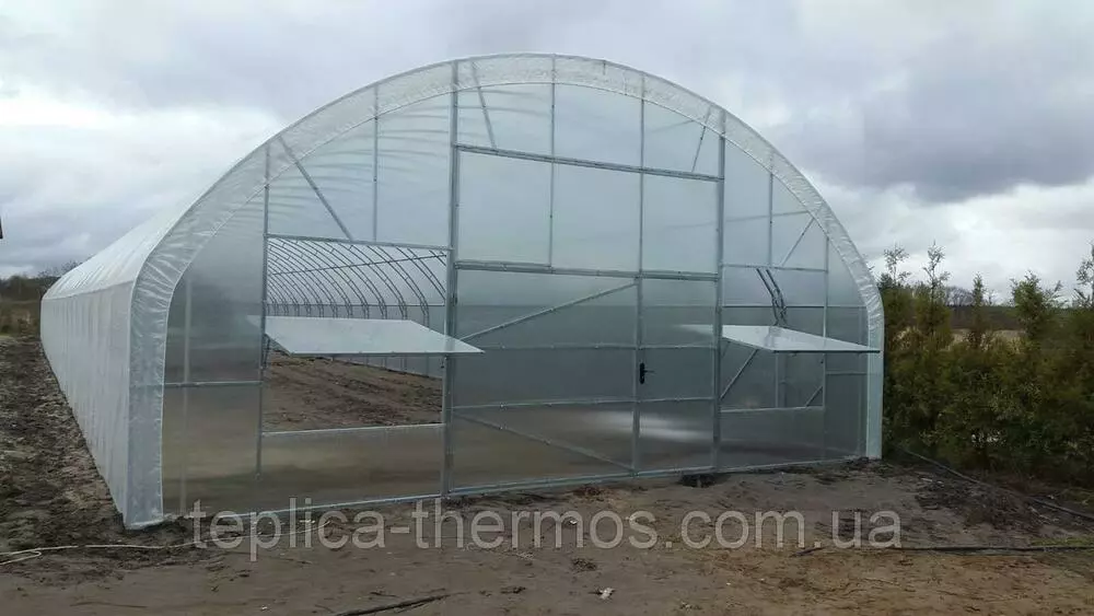 Торці теплиці обшиті полікарбонатом завтовшки 6 мм, уверх теплиці тришарової теплиці 10 сезонної плівки завтовшки 200 мкм
