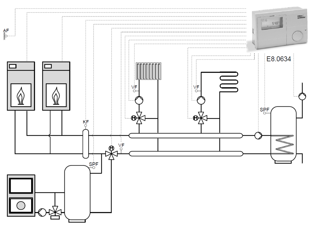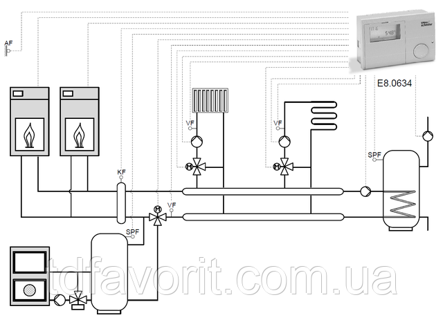 управляет 1 двухступенчатым теплогенератором (2 одноступенчатыми), 2 контурами со смесителями и контуром подготовки ГВС с линией рециркуляции.