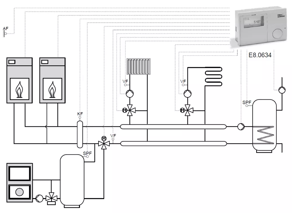 Дополнительно, через многофункциональное реле МФ1, может управлять насосом еще одного прямого отопительного контура (без временных программ), отбором теплоносителя от твердотопливного котла или солнечного коллектора.