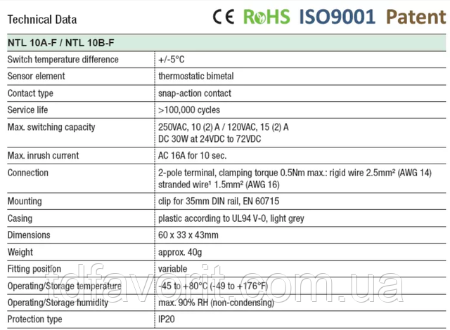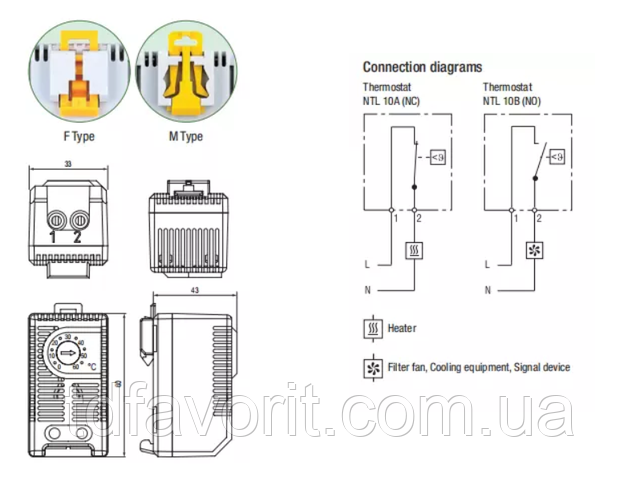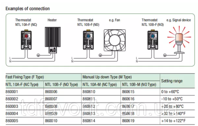 NTL 10A-F / NTL 10A-M: Термостат (нормально закритий);Контактний вимикач для регулювання нагрівачів. Контакт відкривається коли температура зростає.