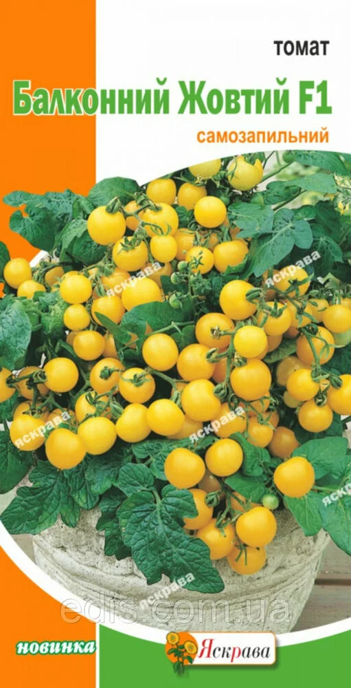 Томат Балконний Жовтий 7 семУльтраскоростиглий низькорослий сорт, призначений для вирощування не тільки у відкритому гунте, але і в вазонах, на підвіконнях, на балконах і навіть в зимових садах. Висота рослини 30-40 см. Плоди мають яскраво - жовтий колір, вага близько 20-30 м і виділяються відмінним солодким смаком. Плодоношення і дозрівання плодів йде безперервно, починаючи з липня і до заморозків. Можна використовувати в свіжому вигляді в салатах і для цільноплідного консервування. Посів: на розсаду - лютий-березень; висадка розсади в гунт - травень-липень.