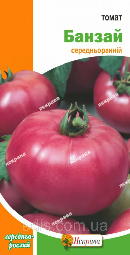 Томат Банзай 0,1 гСередньоранній (100-105 днів від сходів до плодоношення), середньорослий (до 1,0 м) сорт, рекомендований для плівкових теплиць і відкритого гунта. Посів на розсаду в кінці березня-початку квітня. Пікіровка - у фазі першого справжнього листка. Висадка - на початку-середині травня (якщо квітень теплий, то висадка розсади можлива в кінці квітня). Плоди плоско-округлої форми, масою 160 г, рожеві, ніжні, дуже смачні і запашні. Прекрасно підходять для приготування салатів. Схема посадки 40*60 см. Сорт стійкий до збудників вірусу тютюнової мозаїки, кладоспоріозу, фузаріозу. Врожайність однієї рослини 3,0 кг. Посів на розсаду в кінці березня-початку квітня. Пікіровка - у фазі першого справжнього листка. Висадка - на початку-середині травня (якщо квітень теплий, то висадка розсади можлива в кінці квітня). Формують в одне стебло, видаляючи всі «пасинки». При утворенні п'ятого суцвіття починають видаляти нижні листки по 2-3 на тиждень.