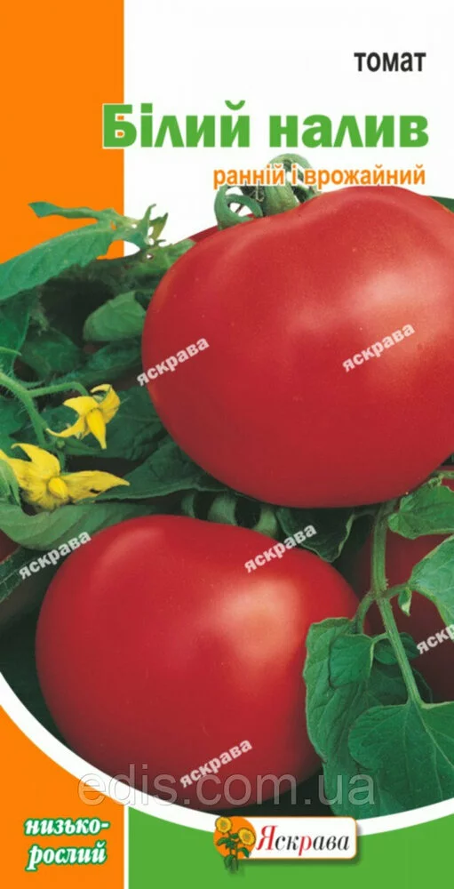 Томат Білий налив 0,2 г Сорт ранний, дружно созревает. Вегетационный период - 80-110 дней. Формирует компактный куст высотой до 50 см. Плоды массой 90-130 г, округлой формы, ярко-красные, высоких вкусовых качеств. Устойчив к фитофторозу. Применяют преимущественно свежими. Используют для выращивания в открытом гунте и пленочных теплицах. Тепло и светолюбивое культура. Выращивают рассадным или безрассадным способом. Норма высева семян в парник с пикировкой 6-8 г, без пикировки 3-4 г на 1 м(2). Рассаду высаживают в первой-второй декаде мая. В открытый гунт семена высевают при t + 13-15 C с нормой 5-6 штук на 1 пог.м. Глибина загортання 1,5-2 см. Ширина міжрядь 70 див