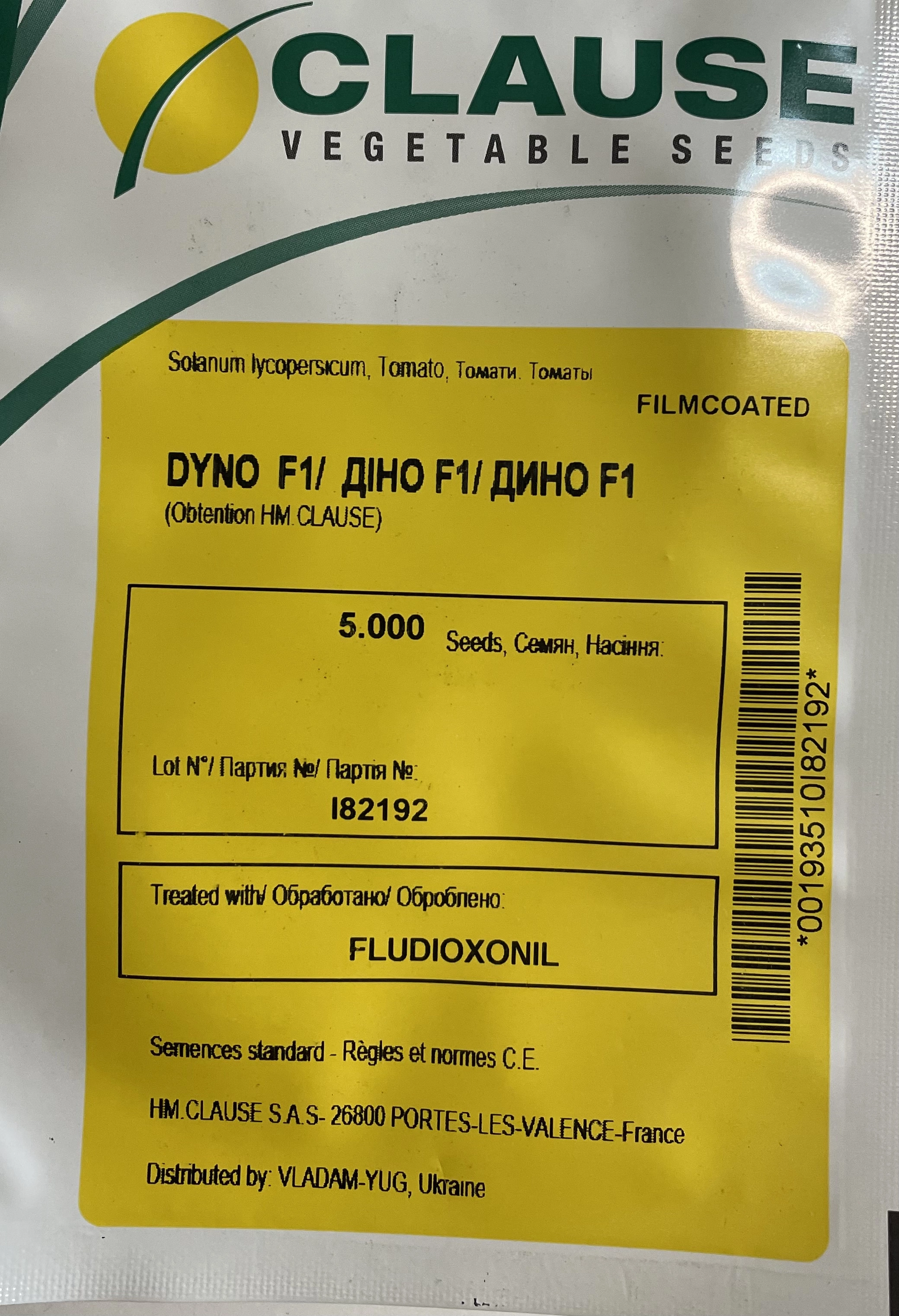 Томат Діно F1 — середньоранній гібрид томата детермінантного типу від французької компанії Clause. Період вегетації рослин складає 70–75 діб з моменту висадки розсади на постійне місце зростання. Гібрид призначений для вирощування у відкритому ґрунті. Користується великою популярністю у фермерів та представників переробної промисловості. Гібрид Діно F1 формує середньорослу, збалансовану, рясно облиственну рослину з дозріванням плодів на кожному кущу на 98%. Плоди не дрібніють до верху куща, легко знімаються разом з хвостиком. Плоди насичено-червоного забарвлення, сливо видної форми, масою 130–150 г. Вміст сухих речовин — 4,8–5,0%. Томати 3-камерні, мають дуже щільну внутрішню структуру, товщина стінки — 9–10 мм. Плоди однорідні та вирівняні, мають високі смакові якості. Підходять для вживання у свіжому вигляді, переробки та реалізації на ринку.