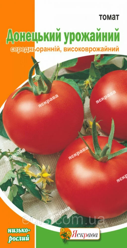 Томат Донецький урожайний 0,2 гСорт середньоранній, високоврожайний, універсального використання. Вегетаційний період 90-100 днів після появи сходів до масового плодоношення. Період плодоношення триває 35-55 днів. Плоди великі, плоско-округлі й округлі, яскраво-червоні, гладкі, масою 150-180 г Смакові якості високі. Сорт консервного та столового призначення. Середня врожайність - 410-750 ц/га, товарних плодів - 370-600 ц/га.