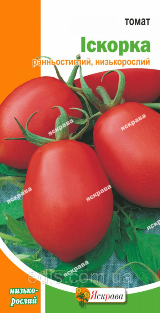 Томат Іскорка 0,2 гРанньостиглий сорт. Вегетаційний період від сходів до початку дозрівання 95-105 днів. Кущ низькорослий, висотою 40-55 см. Плоди сливоподобные, гладкі, яскраво-червоного кольору, масою 80-110 м, відмінних смакових якостей, не розтріскуються, добре зберігаються і транспортуються. Сорт універсального призначення, використовується для споживання у свіжому вигляді, переробки.