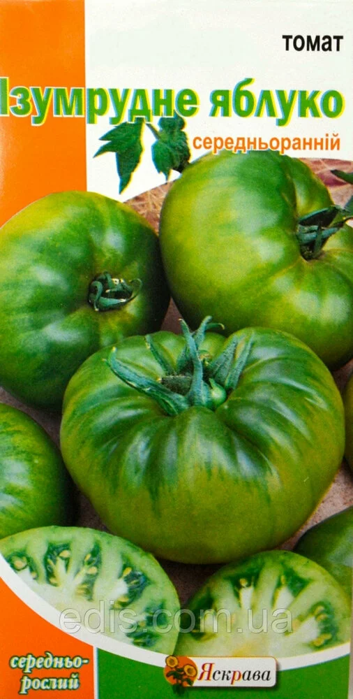Томат Смарагдове Яблуко 0,1 гСередньоранній, партенокарпічний. Вегетаційний період - 98-105 днів. Рослини заввишки до 1 м Плоди круглі, яскраво-зелені, соковиті, масою 100-200 г, транспортабельні. Дозрівають до масової появи фітофторозу. Сорт з хорошими смаковими якостями, придатний для споживання свіжими і для переробки.