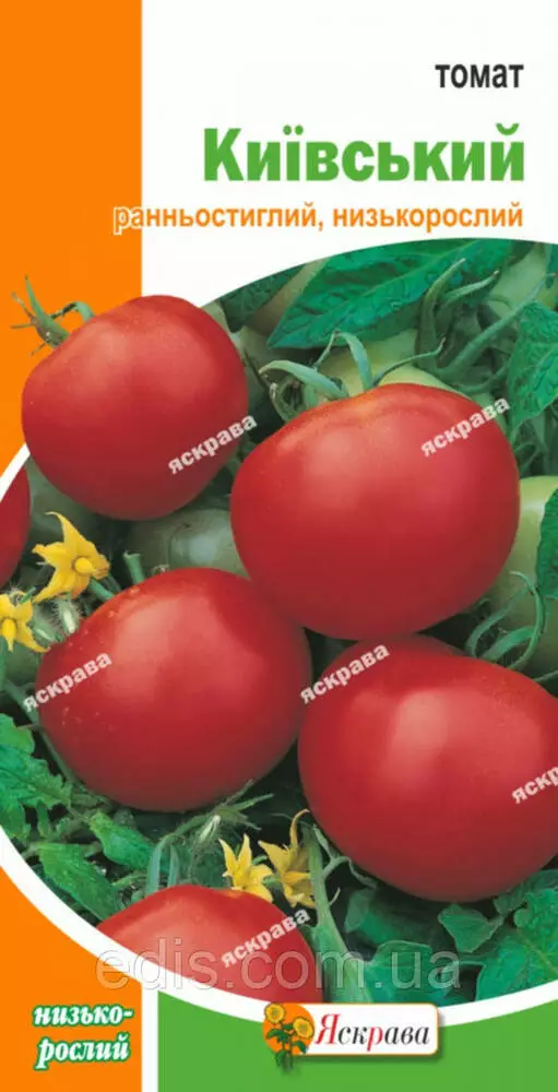 Томат Київський 0,2 гРанньостиглий. Тривалість вегетаційного періоду - 106-112 днів. Рослина висотою 37-60 см. Плоди вирівняні, округло-плоскі, гладкі, середньою масою 70-88 г Придатні для споживання свіжими і для консервування. Смакові якості високі. Сорт відносно стійкий до фітофторозу.